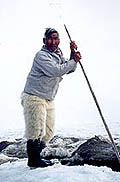 地球の地軸の頂点、色のない世界で、絵と自分自身を見つめ直してみたい。そう思ったら矢もタテもたまらず、いろいろな資料を調べ、あちこちツテをたどり、めざした所が、世界最北のエスキモーの村、「シオラパルク」だったのです。ここはデンマーク領なので、デンマーク大使館に申請をし、またアメリカの基地がある為、特別の許可証が要るので、その手続きにとおおわらわでした。そして、ついに念願がかない、平成3年6月30日、成田空港を出発、7月30日まで約1ヵ月間、グリーンランドの生活体験をして8月3日帰国しました。